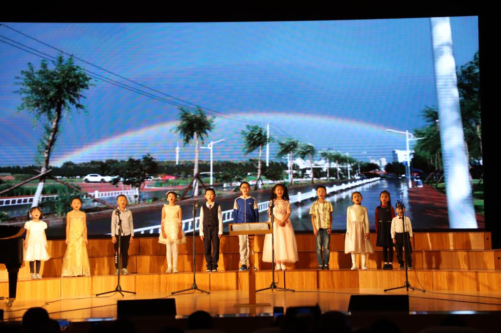 一曲蒙古族民歌《八骏赞》是激荡草原的赞歌,使我们仿佛置身于广袤无垠的大草原中,感受骏马奔腾,自由自在。随后的女声合唱《踏莎行》,古调新咏显示了中国风的独特魅力,且看雨霁风光,千花百卉争明媚。接下来,吕秀霞教授带领小朋友们为大家带来的的合唱曲目《我们多么幸福》、《歌声与微笑》点燃了全场的热情,给在场的观众们带来了一份巨大的惊喜,萌娃们用稚嫩而纯净的童声诉说着对东农70年华诞的祝福。而后,一曲舒缓优美的《彩虹》让我们似徜徉于云端之上,仿佛在漂泊与彷徨的时刻都有一道彩虹相伴,使听者沉浸其中,慢慢回味这份感动。