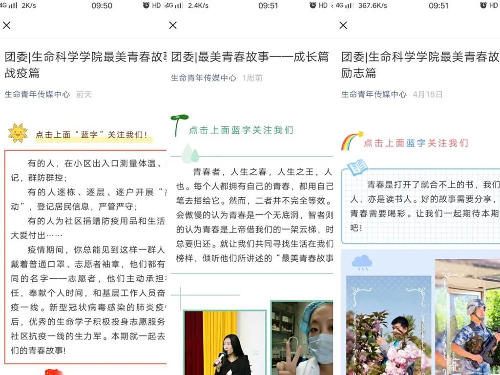 为树立先进典型、弘扬青春正能量,院团委分为“励志篇”“成长篇”“战疫篇”等栏目开展“最美青春故事”系列推送,优秀青年学子以自己的奋斗经历和感悟,激励更多团员青年胸怀梦想、脚踏实地,质朴感人的文字传播着正能量,在青年中引发共鸣。