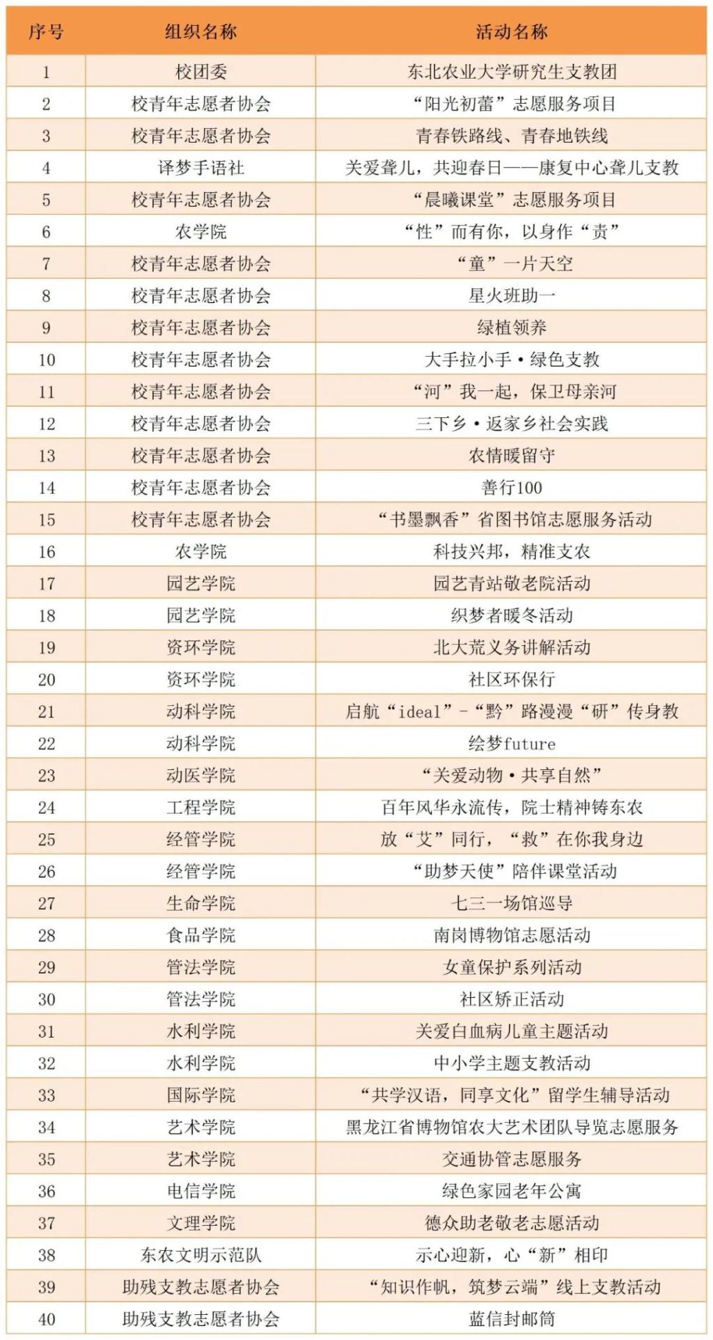为深入贯彻落实习近平总书记近日对开展学雷锋活动作出的重要指示精神,继续大力弘扬“奉献、友爱、互助、进步”的志愿精神,营造良好的校园志愿服务氛围,校团委现将开展“雷锋精神我传承,青春闪耀新时代”东北农业大学志愿服务项目展。