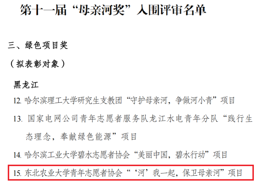 近日,全国第十一届“母亲河奖”评选活动发布表彰名单,我校青年志愿者协会“‘河’我一起,保卫母亲河”项目荣获第十一届“母亲河奖”绿色项目奖提名。