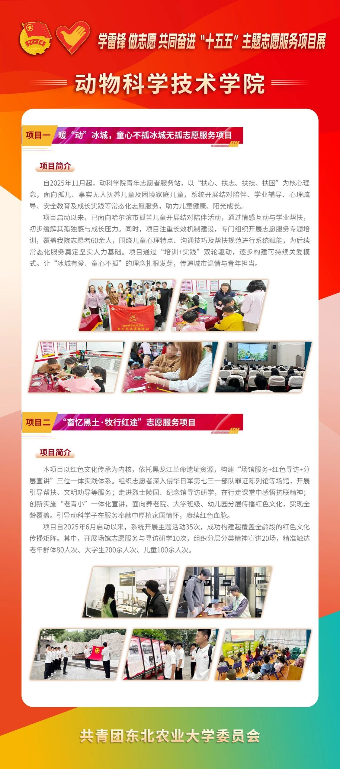 为深入学习贯彻党的二十届四中全会精神和习近平总书记致中国志愿服务联合会第三届会员代表大会重要贺信精神,全面落实立德树人根本任务,大力弘扬雷锋精神及“奉献、友爱、互助、进步”的志愿服务精神,引导我校青年在服务国家战略、百姓民生、社会治理中彰显青春担当,推动学雷锋志愿服务精准化、专业化、品牌化、常态化,各学院紧扣学科优势与社会需求,深耕打造一批特色鲜明、成效突出的品牌志愿服务项目,以志愿实践凝聚青年力量、强化使命担当。