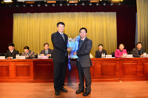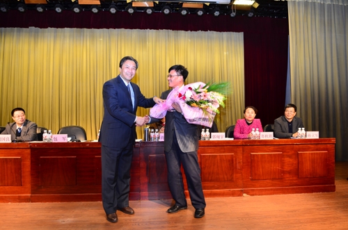 在全场热烈的掌声中,校领导及蒋亦元院士向成功获得国家杰出青年科学基金资助的我校特聘教授向文胜教授和国家科技进步二等奖获得者江连洲教授及其他获奖同志敬献了鲜花并表示祝贺。