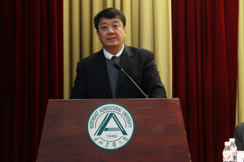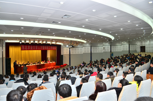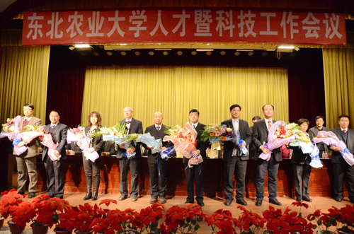 为深入推进干部队伍管理改革、人事制度改革及优秀人才强校工程、重大科技创新工程及社会服务支撑工程,切实加强人才队伍建设,不断提高科技创新能力,大力促进科技成果推广及产业化,加快推进“五项改革”、“六大工程”建设,进一步提升高水平农业大学建设水平, 12月22日下午,东北农业大学人才暨科技工作会议在图书馆一楼报告厅举行。全体校领导,工程院院士蒋亦元,正、副处级干部、各级学科带头人及学科团队带头人、各级重点实验室负责人,组织部、人事处、科学技术处、学科建设处、新农村发展研究院、园区与产业办公室全体工作人员及其他党政机关正科级干部、各学院教职工代表参加会议。会议由校党委副书记胡国良主持。