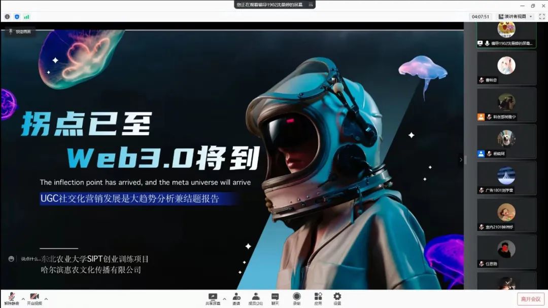 根据省教育厅《关于开展2022年度黑龙江省大学生创新创业训练计划项目中期检查及2021年度结题验收工作的通知》要求和部署,结合《东北农业大学大学生SIPT计划项目管理办法》相关规定,艺术学院于2022年4月20日下午在线上举办会议模式2022年大学生SIPT计划项目中期暨结题答辩。评审工作组由彭博老师、杜冰老师、董立娟老师、冀轶卿老师、李奕锋老师组成。秉持着公平、公正、公开的原则,对各团队项目进行中期暨结题审评。