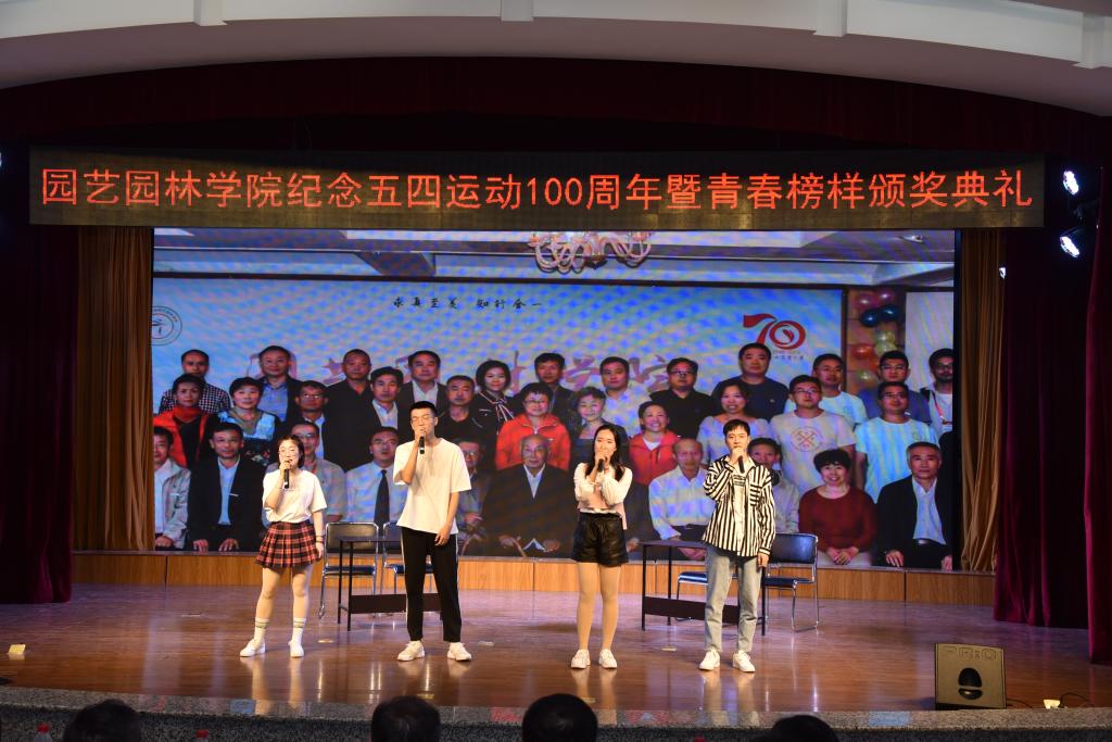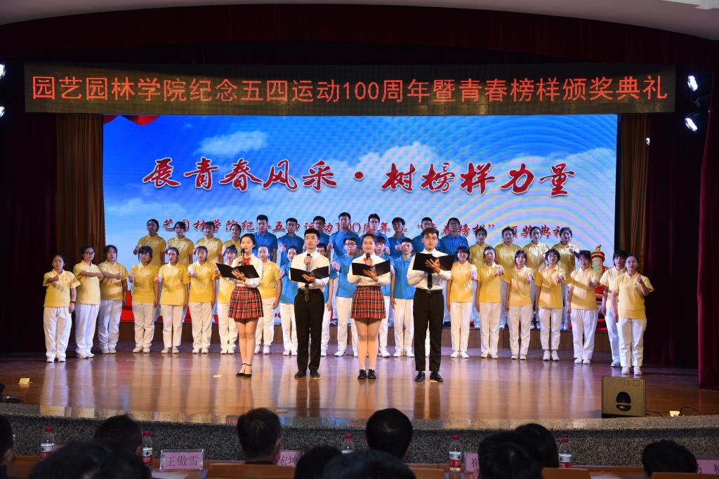颁奖典礼还演出了精彩节目,展现出学院学生风采。诗朗诵《今天,我们这样爱国》回顾了从五四运动起一代又一代青年为国奋斗的历史,并号召当代青年要热爱祖国、牢记使命;歌曲联唱《致青春》音画结合,呈现了过去一年学院的共青团工作;舞蹈《律动青春》展现了园艺学子积极向上的精神风貌;音乐情景剧《我的大学生活》笑中带泪,重现了大学生活熟悉的画面、温暖的瞬间,将颁奖典礼推向高潮。