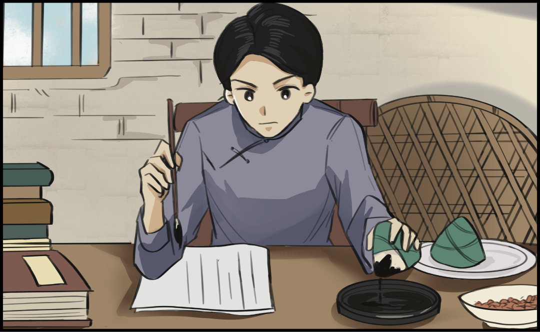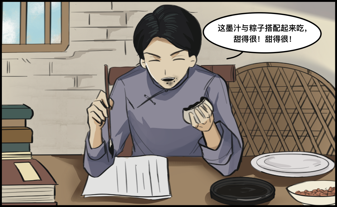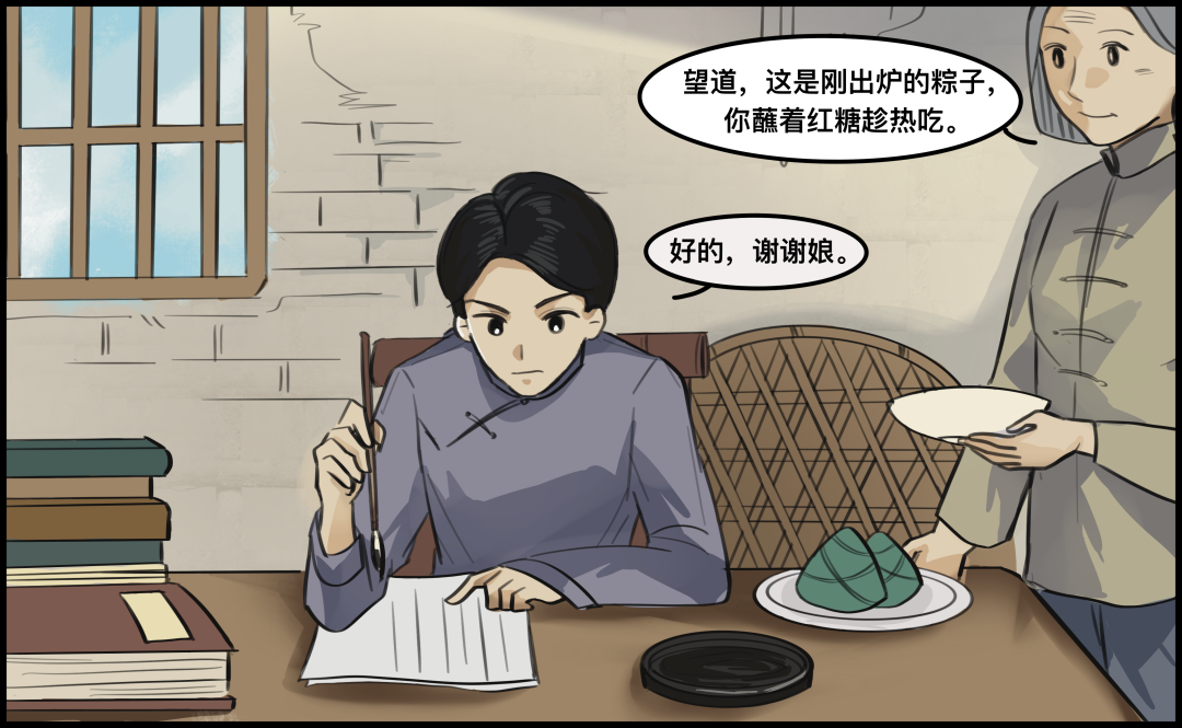 故事的主人公陈望道是我国著名的思想家、语言文学家,亦是在五四新文化运动中发挥重要推动作用的共产党人。1920年2月,陈望道以回乡过春节的名义,在“柴房书屋”里潜心翻译《共产党宣言》。陈望道在家乡小村庄的一间柴房中进行翻译工作。陈望道全部注意力都放在怎样翻译好眼前的《共产党宣言》。一天,他的母亲为他送来热腾腾的粽子,还为他端上一碟红糖汁。可谁知当母亲再次回柴房收拾碗碟时,却发现陈望道桌上的红糖汁丝毫未动,一直被他当做蘸料的,是用来写字的黑墨汁。母亲问他嘴边黑乎乎的是什么,他这才反应过来,却又笑盈盈对母亲说:“这粽子配墨汁,甜得很!”