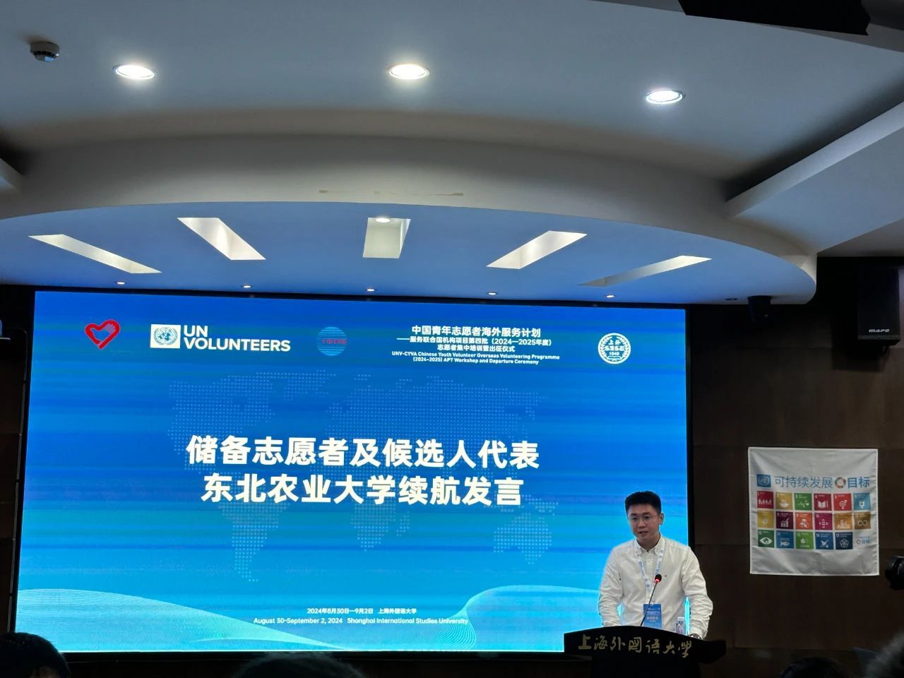 出征仪式上,团中央青年志愿者行动指导中心副主任杨业功、上海外国语大学党委副书记王静、联合国志愿人员组织中国办公室主任张楠共同为即将赴联合国开展服务的青年志愿者代表授旗。联合国志愿人员组织对外关系和宣传司司长尼尔斯·维斯特加德·克努森以视频方式致辞。项目联合实施方负责人联合国志愿人员组织中国办公室主任张楠、商务部中国国际经济技术交流中心联合国业务一处处长田缘诗讲话。我校青年志愿者、动物科学技术学院硕动科2301班续航同学作为志愿者代表发言,表达了参与联合国志愿者项目的意志和决心。