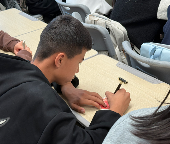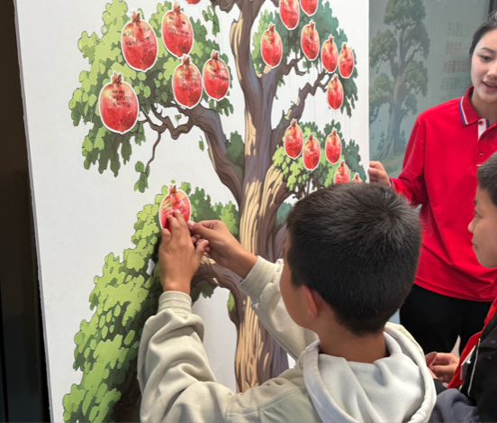 课程尾声,支教团成员结合石榴生动阐释“石榴籽紧密相依,恰似各民族同胞同心同行”的深刻寓意。随后组织学生在石榴贴纸上写下心愿,粘贴至“石榴树”背景板完成集体创作。这棵由一张张心愿贴组成的“石榴树”,在学生心中绘就了一幅由情感与认同联结的中华民族共同体情感地图。