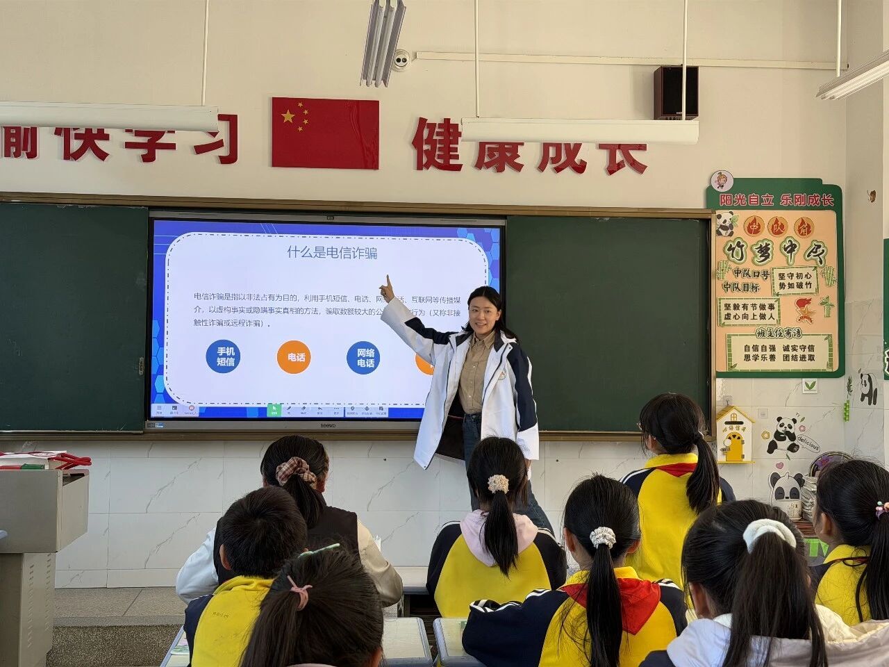 在宣讲环节,支教团志愿者结合中小学生认知规律,针对未成年人网络使用频繁、防范意识薄弱、易被游戏返利、冒充师长等骗局诱导的特点,把专业法律知识与防骗技巧转化为通俗易懂、好记实用的课堂内容。以主题班会、互动课堂为载体,通过案例剖析、趣味问答、风险场景拆解等形式,引导同学们牢记“不轻信、不透露、不转账、遇困先找家长老师”的核心准则,手把手教会大家识别诈骗套路、掌握求助与止损方法。