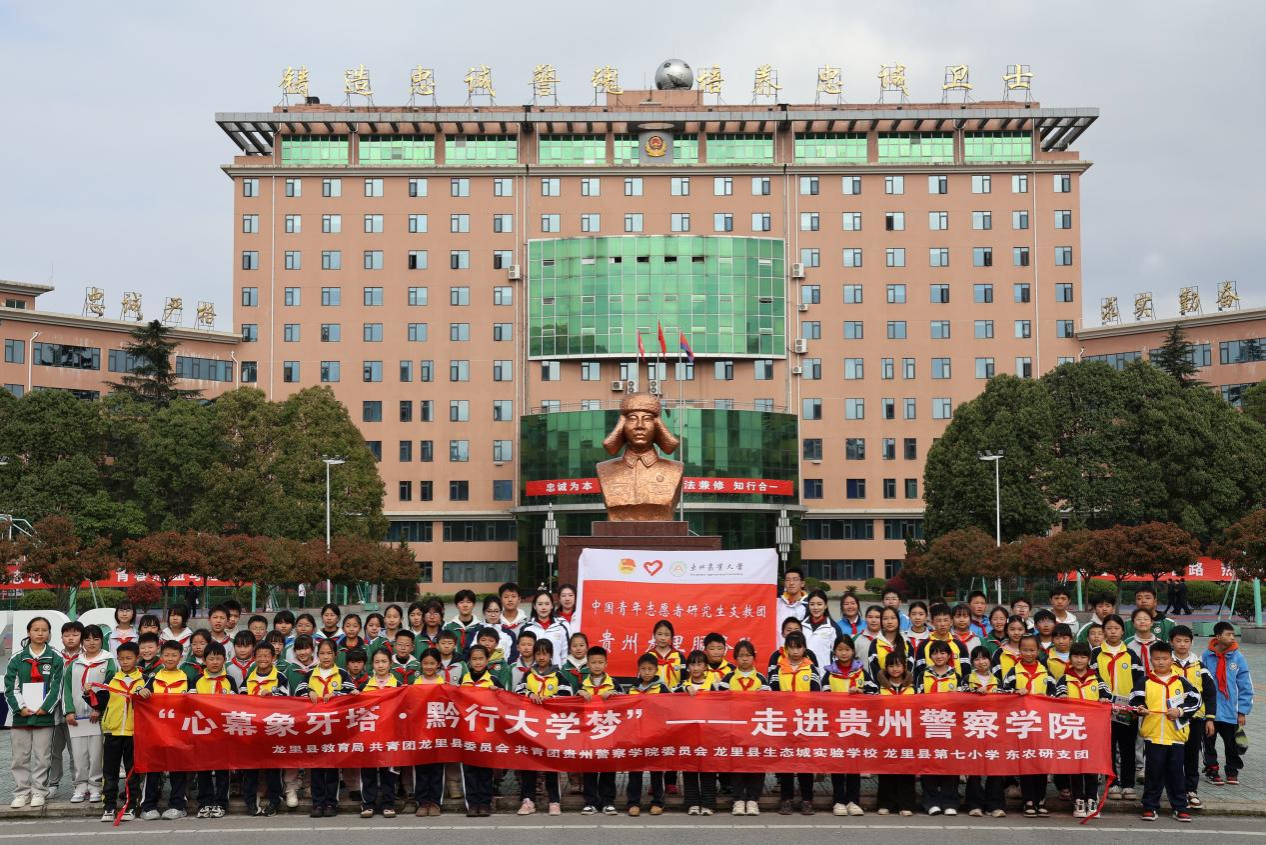 为拓宽青少年视野、厚植爱国情怀,点亮青春梦想,3月18日,东北农业大学研究生支教团贵州龙里服务队联合共青团龙里县委员会,带领龙里县生态城实验学校与龙里县第七小学的80名学生走进贵州警察学院,开展“心幕象牙塔·黔行大学梦”研学活动。通过沉浸式参观校史馆、瞻仰英烈墙、体验警务装备、对话警校学子等环节,让孩子们在庄严与热血中感受公安院校的独特魅力,在心中播下忠诚、担当与奋斗的种子。