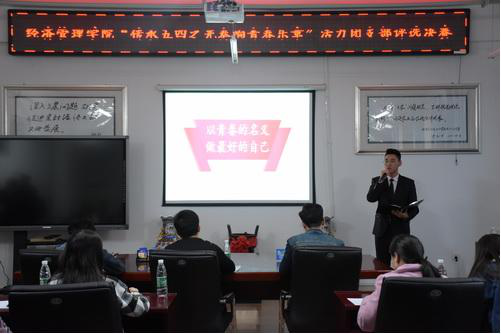 为学习、弘扬五四精神,将五四精神永远传承下去,经济管理学院于2017年4月20日晚六点举办“传承五四之光,奏响青春乐章”活力团支部评选活动。经济管理学院学生团委书记王丰良老师莅临决赛现场,研究生团委副书记、学生团委副书记、类系团委书记及各部门部长出席并担任评委。此次评选分为线上投票和线下演示两部分,十五支入选团支部中有九支队伍在线上评选中脱颖而出作为校“五四红旗团支部”的推荐对象。线下演示环节通过PPT展示和解说员演讲来描绘各团支部的班级面貌、思想政治建设、组织活动及荣誉奖章等部分传递各支部风采。