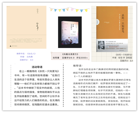 好书分享活动已经开展多期,鼓励同学们分享和交流自己喜爱的优秀文学作品,旨在丰富同学们的精神世界,为大家提供了一个交流和讨论的平台。虽然疫情使我们不能外出活动,但我们的精神却可以在文字的世界里自由翱翔。