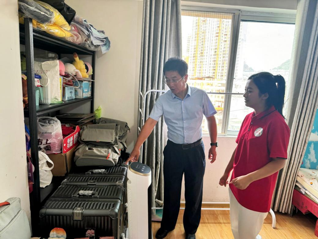 贺景平一行还来到龙里县人才公寓,实地走访支教团成员寝室,详细了解住宿条件与生活环境,并为队员们发放慰问品。贺景平代表学校党委对一直以来关心和帮助东北农业大学研究生支教团的贵州省黔南布依族苗族自治州龙里县各级领导、老师们表示感谢,同时也向研究生支教团龙里服务队表示慰问,嘱托队员们将支教工作与志愿服务深度融合,传承东农研究生支教团的优良传统,弘扬“艰苦奋斗,自强不息”的东农精神,立报国强国大志向、做挺膺担当奋斗者,在志愿服务岗位上绽放青春光彩,为建设教育强国贡献青春力量。